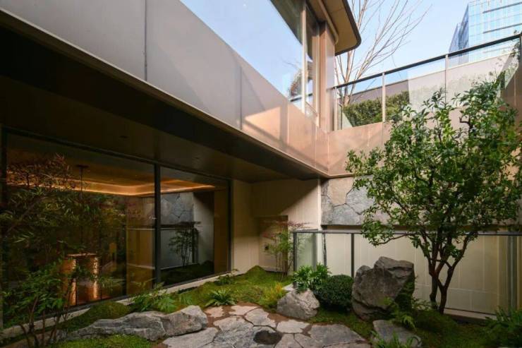 又如下叠“气场全开”的私家庭院——奢阔的空间尺度足以媲美合院级别,不仅是南向的超大院子,甚至北面与侧面,也有院落空间互相打通,形成270°环绕式庭院。