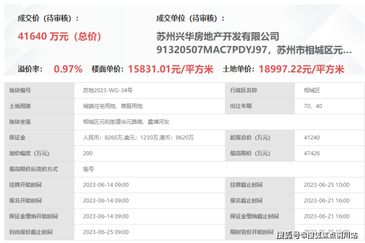 五潨泾澄院,即, 苏地2023-WG-34号地块,位于相城区元和街道华元路南、蠡塘河东,是2023年6月25日,兴华房地产&元和房地产以底价41640万元竞得,成交楼面价15831元/平。