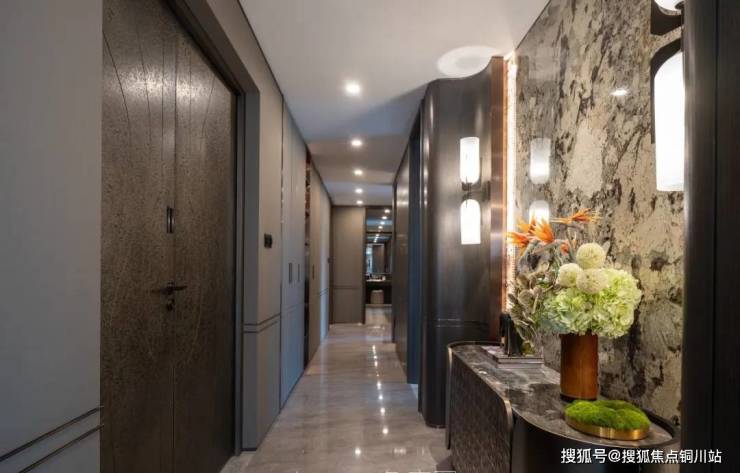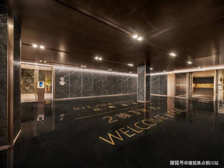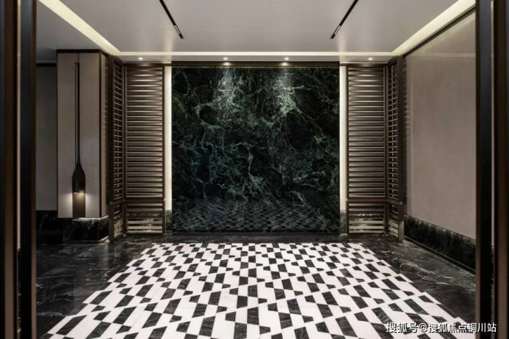 约6米超高空间的车库入口,搭配爱马仕黑廊柱、鎏金金属格栅、星空顶廊道,彰显豪宅气场;车马厅顶面采用铝板铺装,两侧奢石岩板,水磨石地面镶嵌全区域铜制归家标识,一眼震撼。