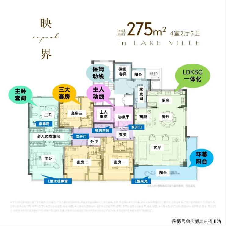 在户型设计上,玖映蠡湖以“可生长的空间” 与 “场景化预埋” 理念,确保产品能伴随主人成长,满足全生命周期的居住需求,极大提升了产品的长期价值与市场竞争力。以建面约275㎡四室两厅五卫户型为例: