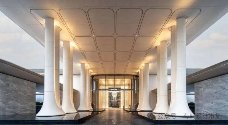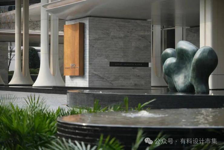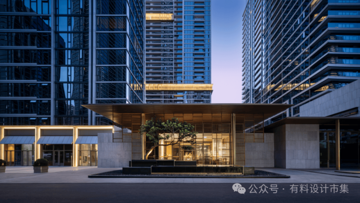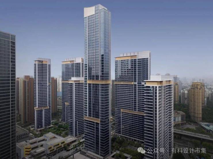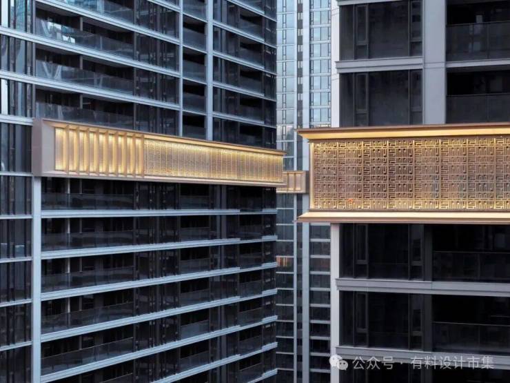 立面设计汲取长江流动水韵的灵感,以风帆造型营造出极具辨识度的塔冠设计。定制的鎏金腰线既以「鎏光织锦」雕琢高定美学立面,更借起伏曲线暗合奔涌江潮之势——将长江「云奔潮涌、勇立潮头」的进取精神,凝练为武汉瑞府的城市精神图腾。