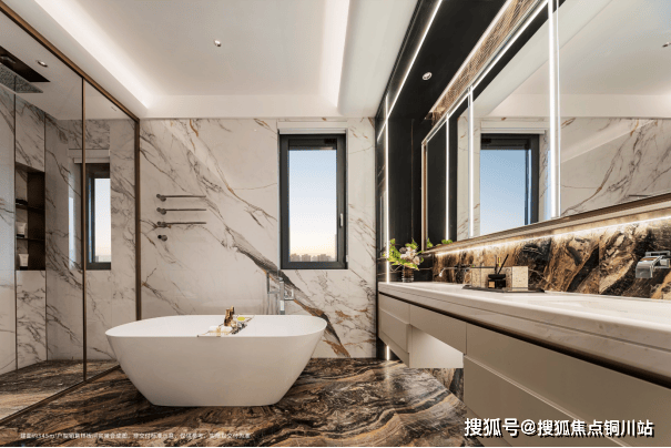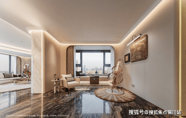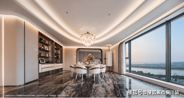 此次公开的建面约345㎡样板间,随处可见江海美学的渗透。除卧室外,地面使用威尼斯棕石材通铺,天然的纹路,如江流奔腾大气磅礴,带来行云流水般的空间层次。