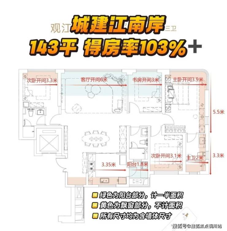 ✅ 优势:三面采光主卧(南向日照 + 北向瞰江),开间达 3.9 米;得房率 113%,压缩 50㎡面积却实现 “零公摊”。