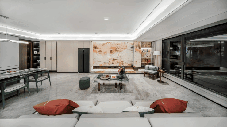 举例来说,那些大约900x1800mm的亮面大砖,采用精密拼接技术,其素洁雅致的纹理从客厅一直延伸至阳台。