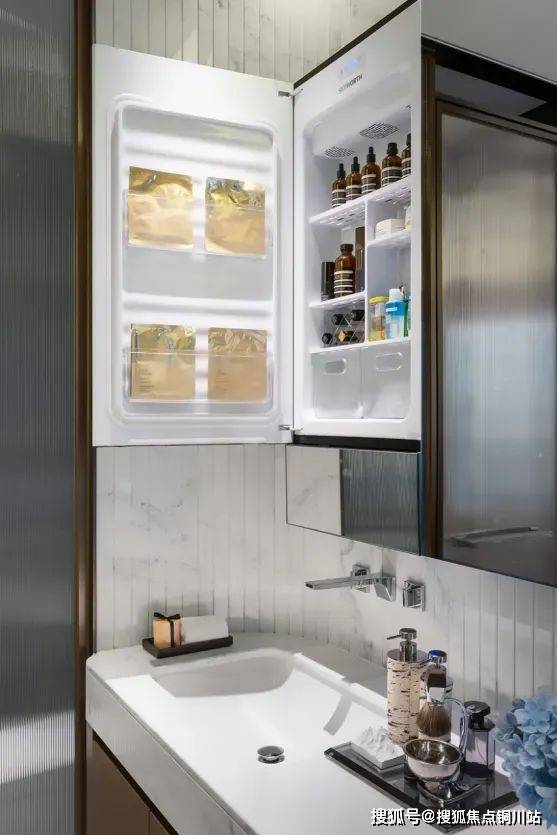 如卫生间安装了美妆冰箱、可显示天气、温度、湿度的魔镜、吹风机以及口红收纳盒等;
