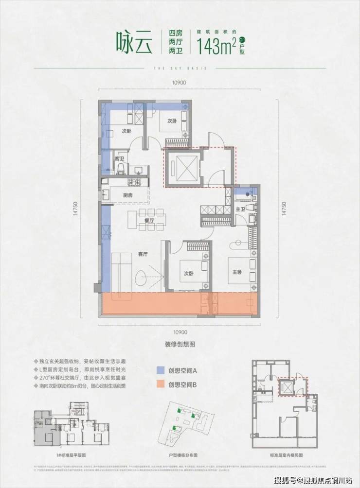 143㎡四房两厅两卫(咏云):户型分布在1、2、4号楼西边户,南向开间约10.9米、进深约14.75米;270°的采光解决了户型中心采光缺陷,户型在1号楼2梯三户布局中相当于私属电梯入户;室内加上飘窗及阳台赠送,户型得房率约在90%。(楼栋不同公摊会有部分差异)