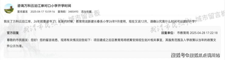 项目西侧教育地块引入长春街系小学(36班)+七一系中学(42班),开发商回复预计2026年9月投入使用。城市留言板留言预计要到12月,具体待教育局公示安排。