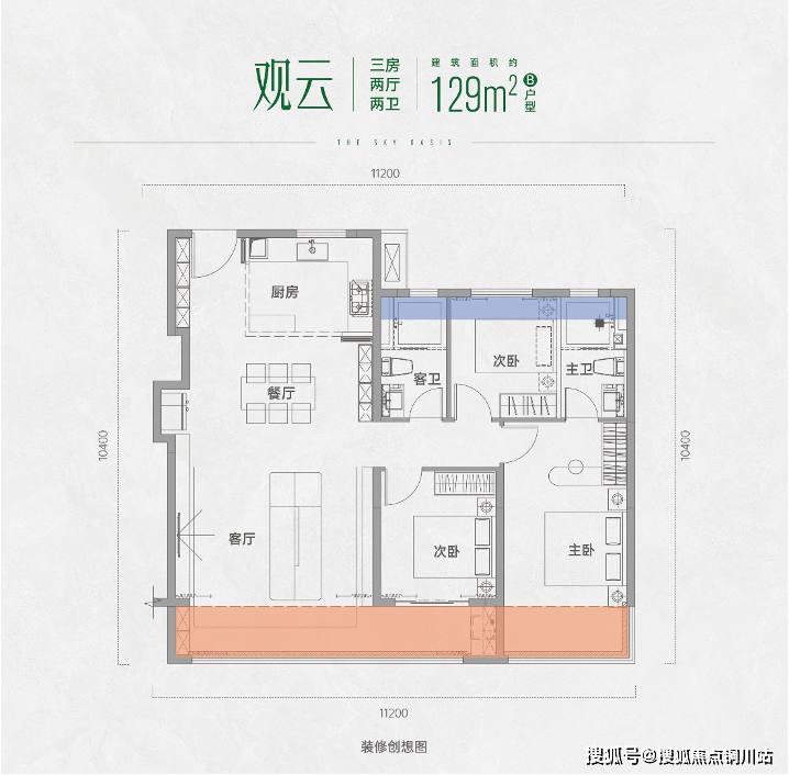 129㎡三房两厅两卫(观云):户型分布在1、4号楼边户;南向开间约11.2米、进深约在10.4米,大开间小进深、采光通风极佳;均有S墙收纳预留设计,室内加上飘窗及阳台赠送,户型得房率约在85%。(楼栋不同公摊会有部分差异)