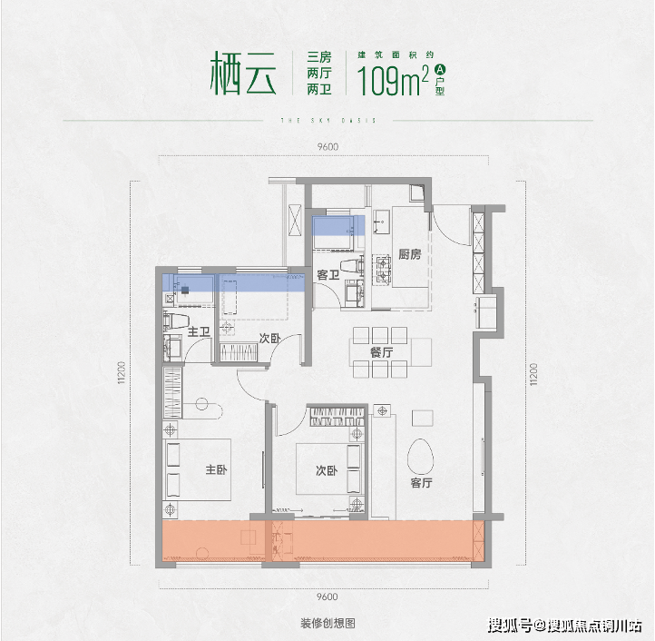109㎡三房两厅两卫(栖云):户型分布在1、2、4号楼南向开间约9.6米、进深约11.2米,标准三开间朝南;中间户布局,S墙设计预留冰箱位置空间,让厨房操作更显从容;室内加上飘窗及阳台赠送,户型得房率约在85%。(楼栋不同公摊会有部分差异)