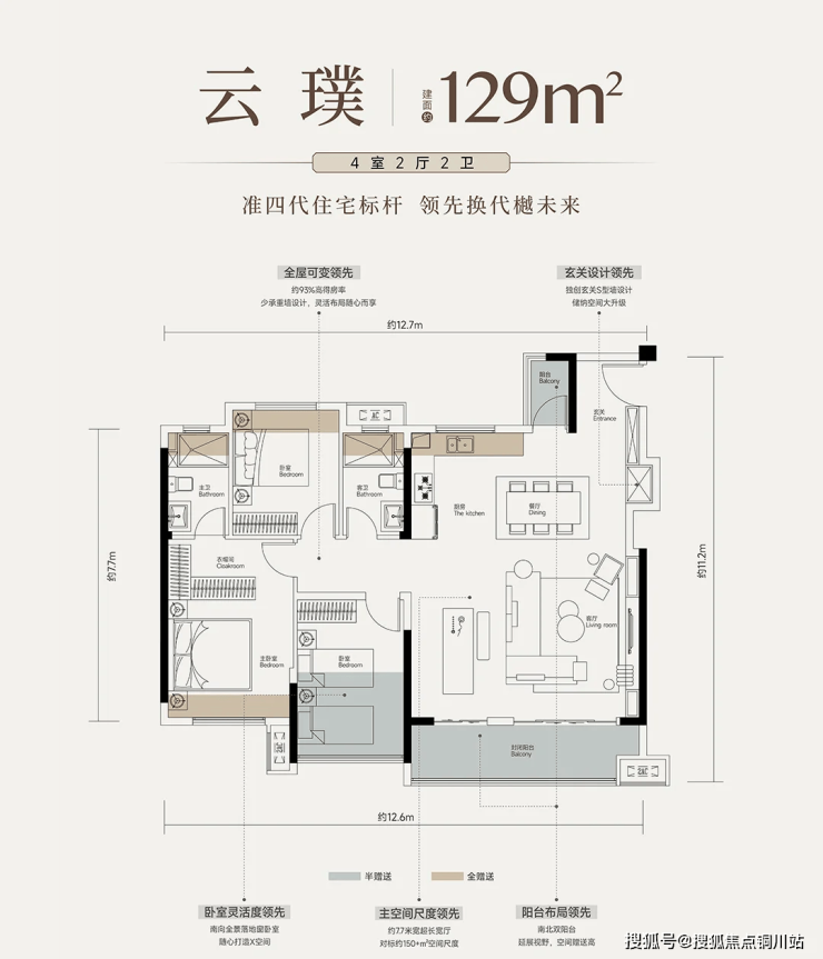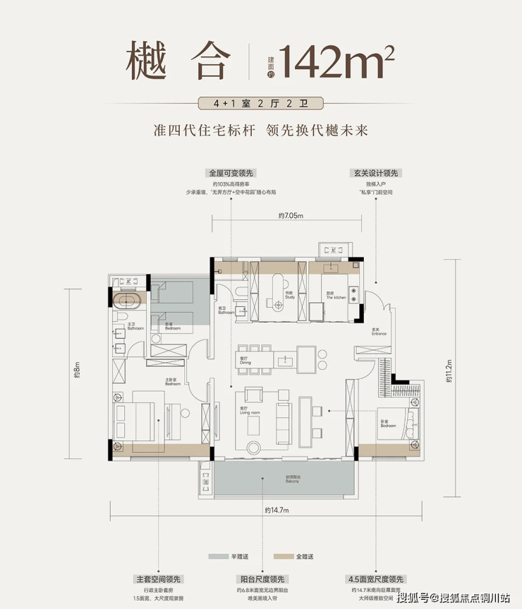 5个飘窗赠送,不仅阳台送一半、连次卧都是赠送一半面积,而且玄关都做成S形、收纳面积比别人多些。