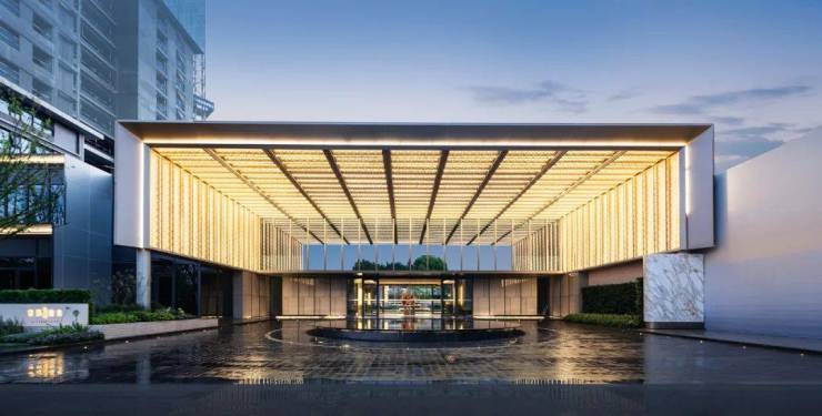 高境府门,高约8米的门头,用铝板、石材、玻璃幕墙等材质。灵感源自上海宝格丽酒店的环岛式落客区、三亚艾迪逊酒店的社区大门、香港瑰丽的社区大堂等设计理念。