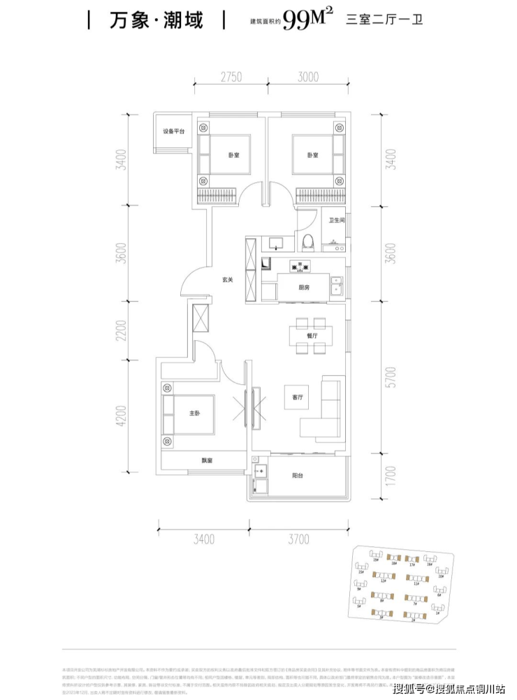 像建面约99㎡的洋房户型,做到了3房2厅1卫户型设计,为买房人提供了一个低总价上车高品质住区的机会。