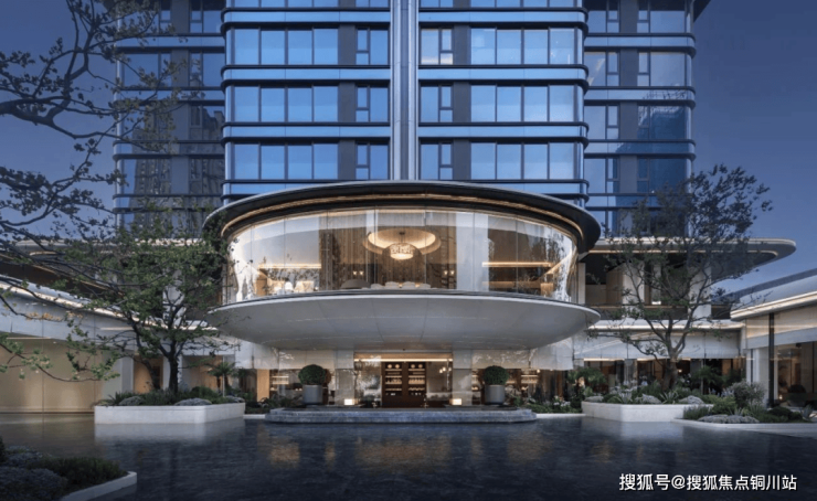高层入户门头以26米宽曲线铝板与全景玻璃构筑,形成“会堂级”入口空间。外立面采用270°上帝弧线窗与幕墙系统,兼具典雅造型与高空间效率。