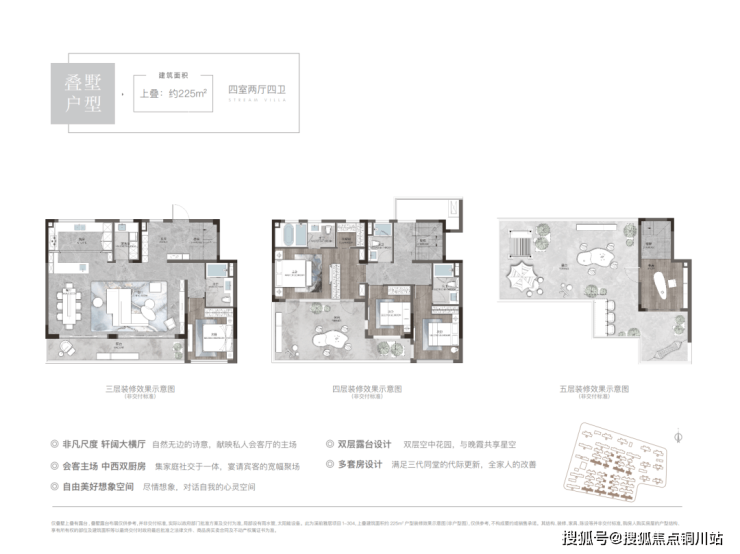 比如建面约225㎡的上叠户型: