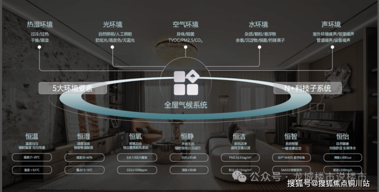 隐萃配置全屋气候系统,以5.0全屋气候科技,综合调控室内热湿环境、空气环境、水环境、光环境、声环境,构建“恒温、恒湿、恒氧、恒静、恒洁、恒智、恒怡”的舒适健康人居。