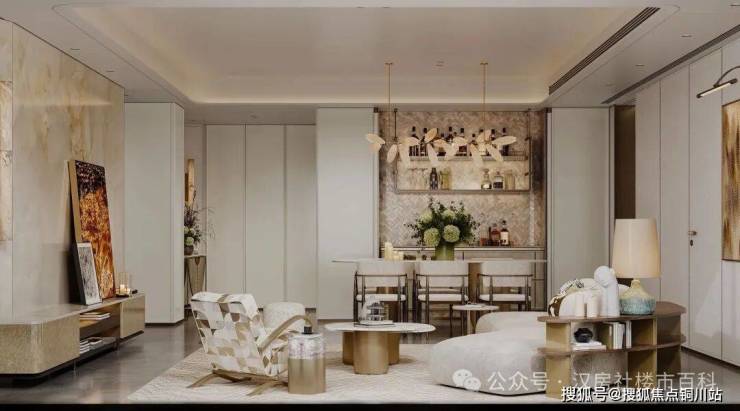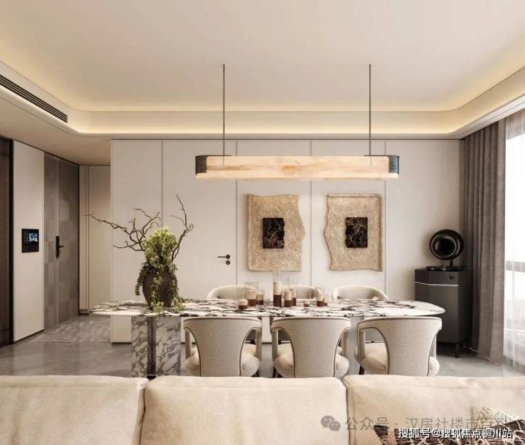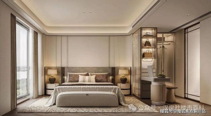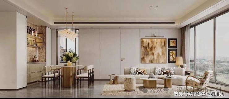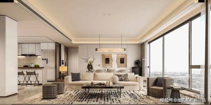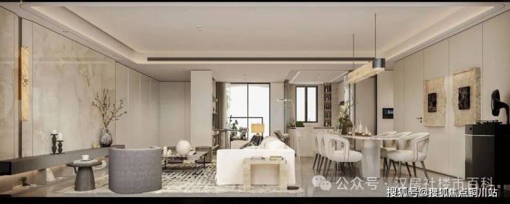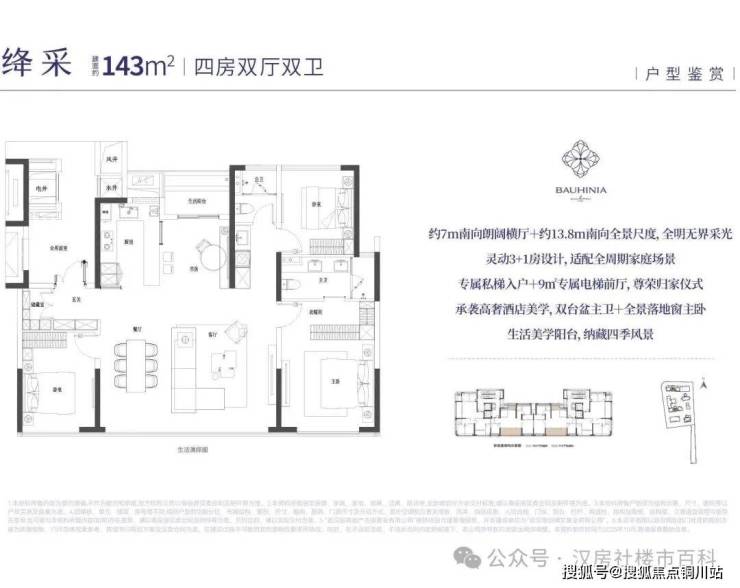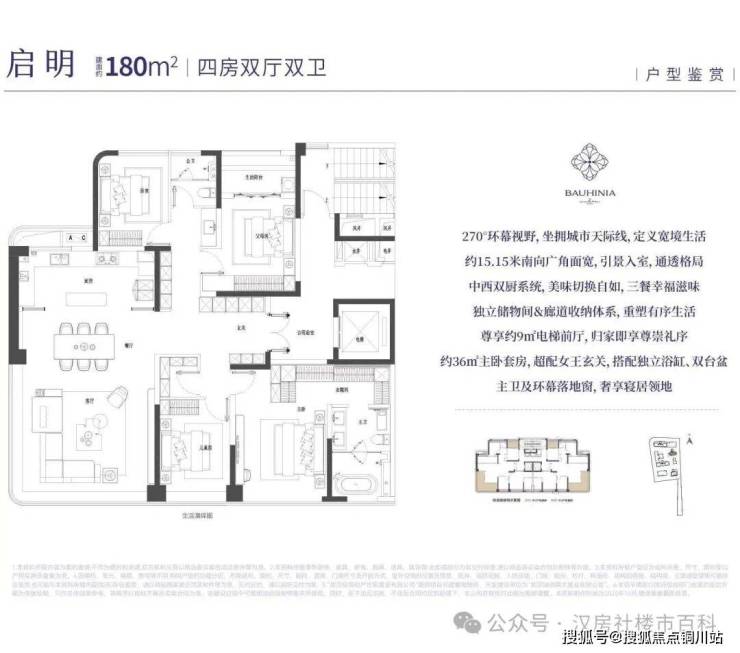 该户型位于2 号楼,是典型的大平层豪宅结构,餐厨、客厅一起,客厅 270° 全景舱观景和采光兼顾。四个卧室在南北向各有两个,主卧大套房以及主卫全朝南。唯一的缺点就是只有2 个卫生间。