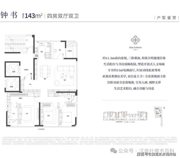 项目共 4 栋楼,其中有1号楼2个单元31层,均为143m²户型;2号楼独单元31层,均为180m²户型;3号楼2个单元32 层,均为143m²户型;4号楼独单元31层,均为143m²户型。项目预计首开 1、2 号楼,所有楼栋均为 2 梯 2 户的独梯入户。