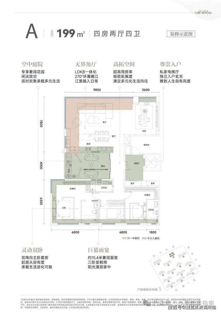 一线看江大平层,新四代头排瞰江环幕三景舱,至高约116%四代负公摊、私梯入户专属前厅、超大空中庭园、约70㎡无柱环厅、270°环幕观江、约15.4米极致面宽。