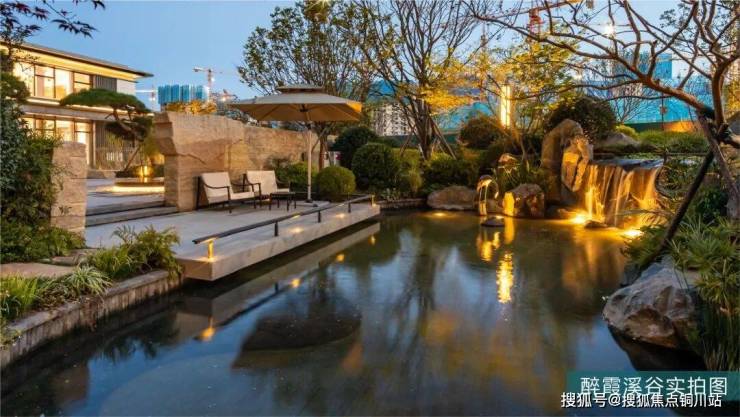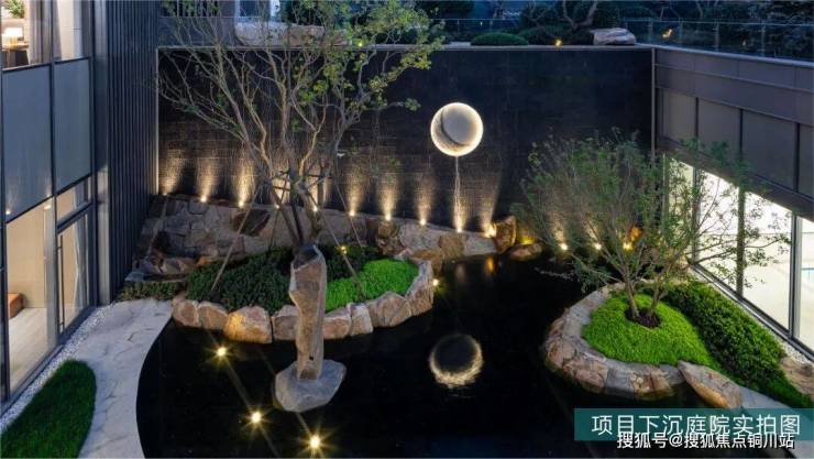 下沉庭院,更是别有洞天。约300㎡下沉庭院巧妙运用水幕景观墙、圆月造型灯光与河北黑石,营造出“溪流石上,人在画中游”的意境,通过全冠移植、错落栽种、360°景观定位等专业技法,确保每一棵树木以最佳姿态呈现,让业主在社区每个角落都能欣赏到不同的风景画卷。