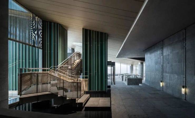 建筑选择涂山窑的陶板作为立面的表情,在室内设计中我们希望将建筑本身的物质在地性延续进来:一方面,确保空间逻辑的完整;另一方面,我们也希望空间的表情是相互对话的,陶板于建筑表面,只可隔水远观,无法触碰,人一旦进入室内,这种物质本身的极性,便能够被触碰到。