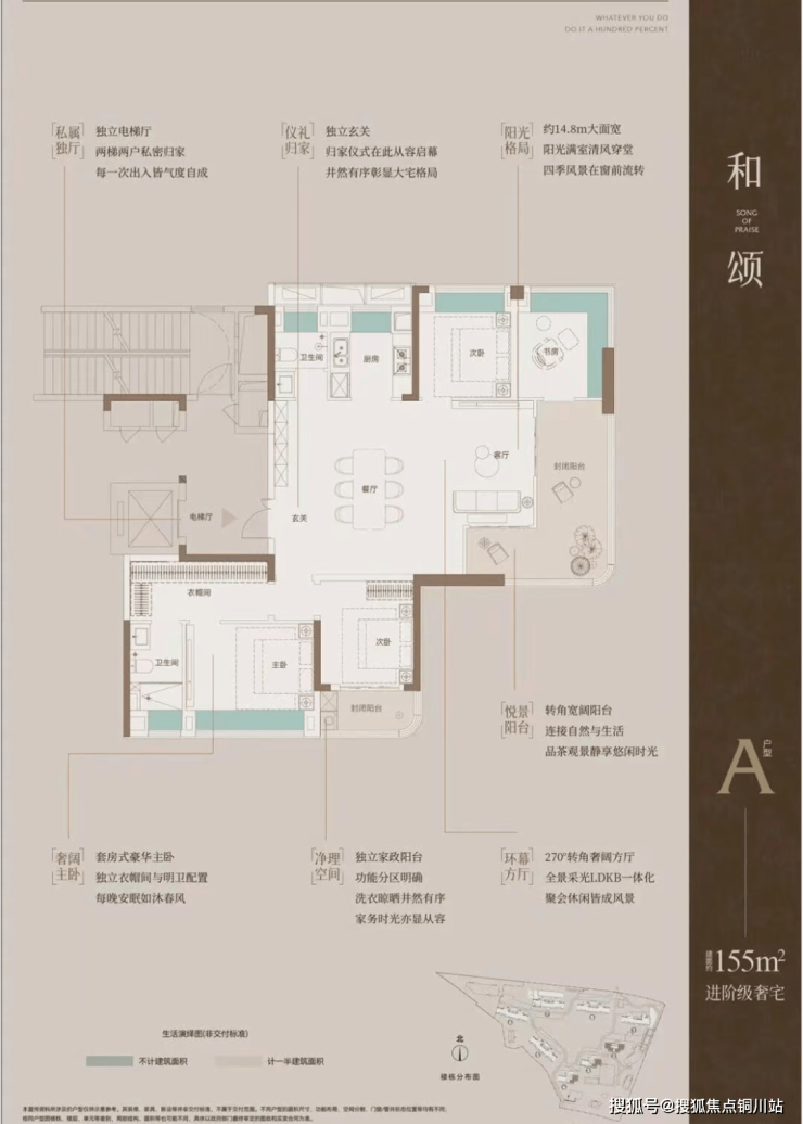 建面约155㎡进阶级奢宅:此户型正是此前创下热销纪录的“王牌产品”。270°转角方厅与独立电梯前厅设计,带来了全景舱式的开阔视野和极强的归家仪式感。LDKB一体化厅、动静分明的科学格局,以及主卧奢阔套房,共同构建了一个兼具社交属性、私密安宁与艺术美感的家庭殿堂,实现了“一步到位”的终极置业梦想。