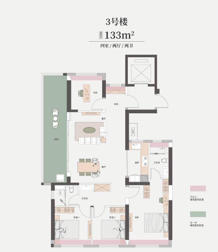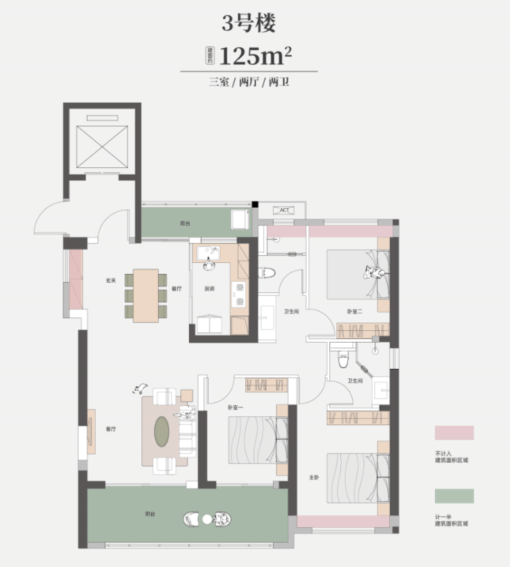 建面约125㎡三房两厅两卫,相对于传统住宅,这个户型最大的特点是,所有卧室是真正的卧室,其中两个次卧都能成为独立的卧室,并预留了合理的收纳空间,实现真正的三代同堂。