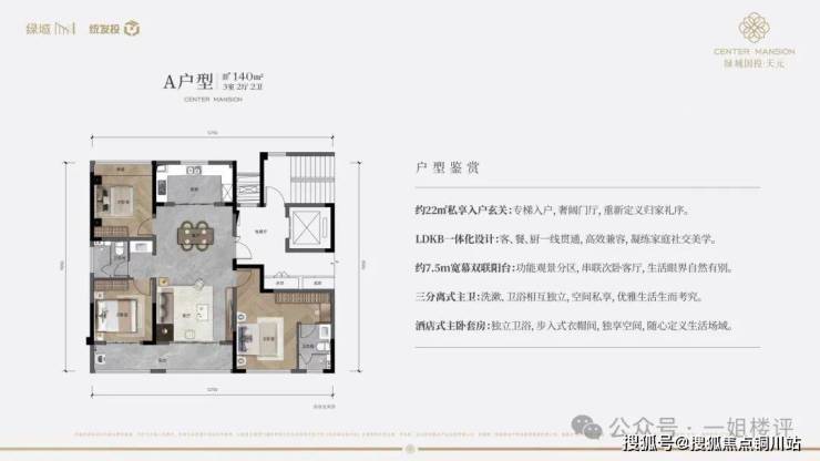 A户型建面约140平3室2厅2卫:南北通透,三开间朝南,厨房和客厅同宽,进门口玄关处赠送较多。