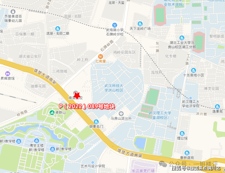 2022年9月27日,P(2022)089号地块由洪山统发投以总价33270万元竞得,楼面地价7883.89元/㎡,溢价率0%,包括一栋写字楼与两栋住宅,地块位置还是不是错的,周边全是大学。