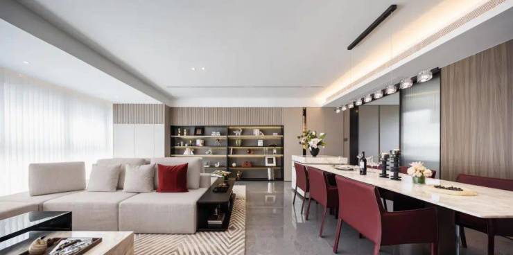 LDKB客餐厨阳台一体化的布局映入眼帘,让公共区域间和谐呼应。约6.6米的尺度横厅和超大面积的落地窗,仿佛为家安装了一块“超大屏”,四季风景尽收眼底。