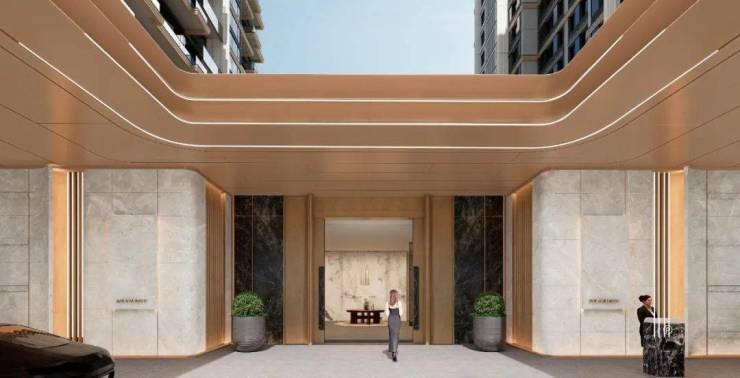在白金配色的墙面和吊顶的映衬下,这个社区大门呈现出舒缓雅奢的静谧氛围。