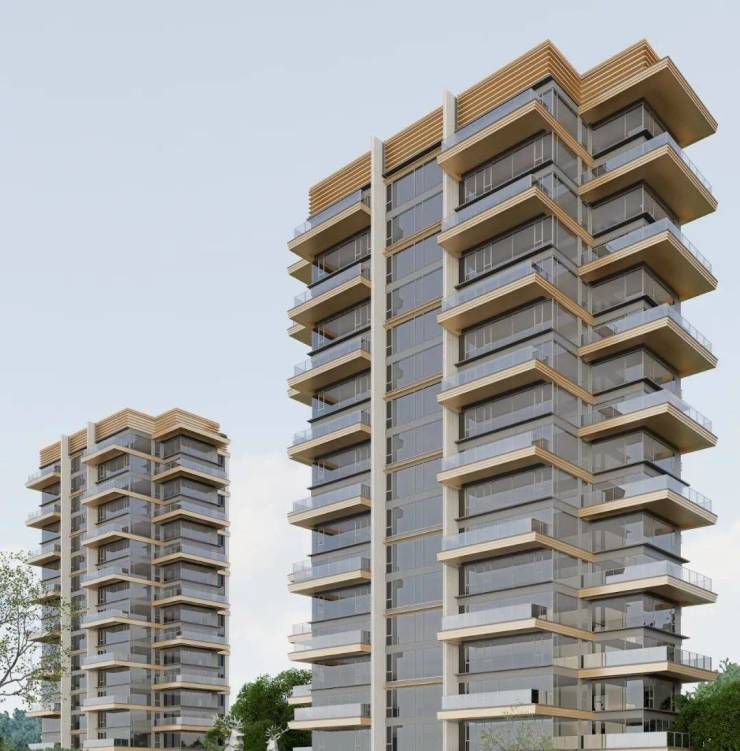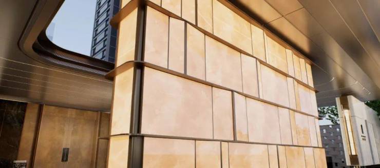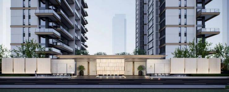 楼栋立面用材采用了香槟金铝板、米白色铝板、高反玻璃、深灰金属型材及涂料等材质,通过“斯卡帕”叠级手法,演绎出建筑的未来科技感和自然生态感。