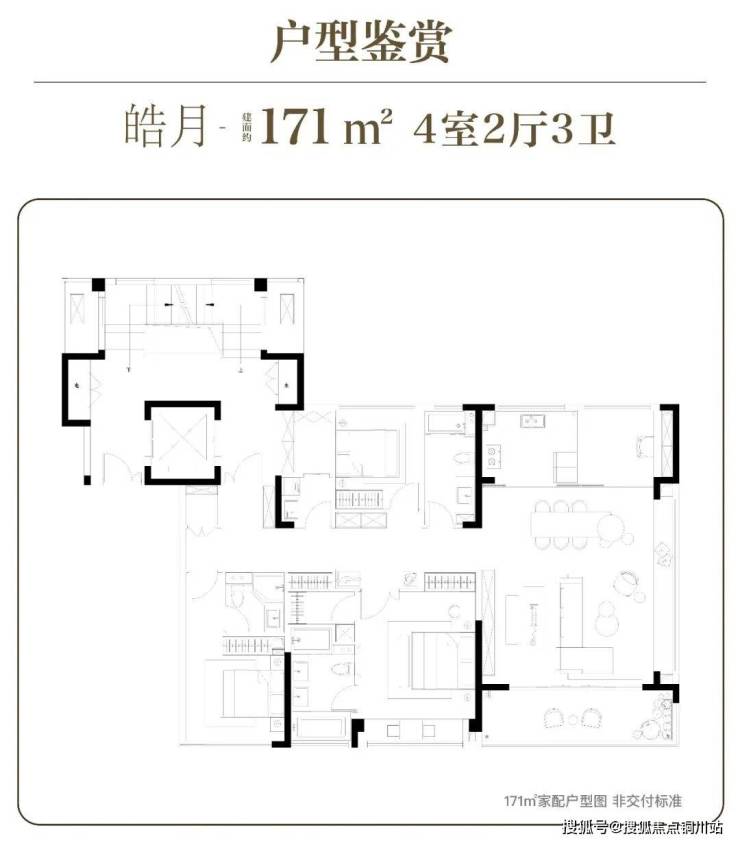 建面约171㎡4房2厅3卫户型:客餐厨与卧室动静分离;270°开阔视界,多面采光;独立家政间,宽室双主卧。
