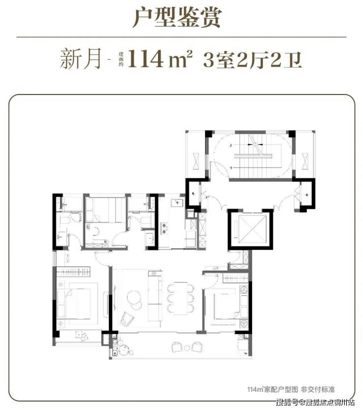 建面约114㎡3房2厅2卫户型:独立玄关,兼具收纳功能与归家仪式感;餐客厨一体化,动线流畅;主卧套房式设计,配备飘窗、衣帽间和独立浴缸等,私密舒适。