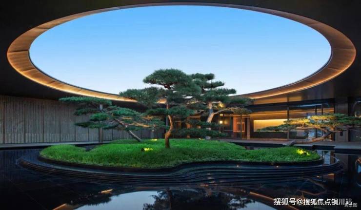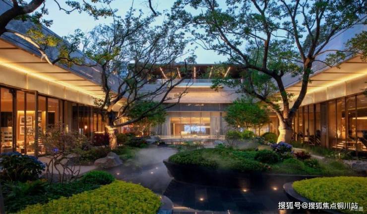 社区主入口柱子特选自巴西铂金钻奢石,呈现历久弥新的金属光泽,格栅照壁采用了4352块不锈钢拼接而成,青蓝色渐变彩釉陶板与青龙呼应。中庭水景历经219次石材切割、495道手工拉槽,构筑“天圆地方”水景庭院,居游之间营造度假式的园林生活。