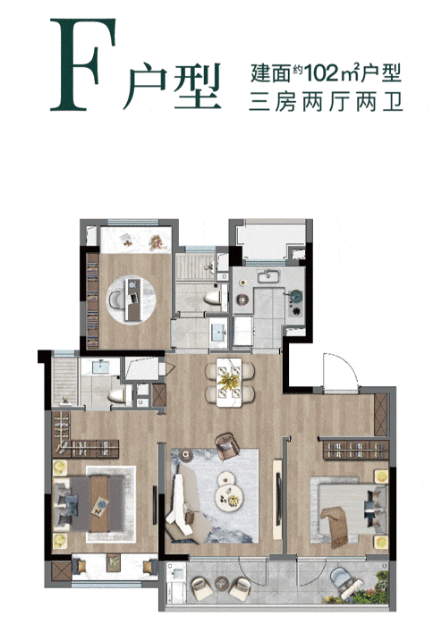 除此之外,另一102㎡的洋房户型也同样值得关注,产品设计为三开间朝南,双阳台加飘窗,最大限度提高室内采光;主卧搭配独立的衣帽间与卫生间,私密性得以保障。