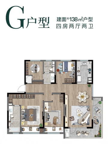 樾湖尚郡138㎡洋房户型,设计L型直角阳台,270°环幕视野,整个公区都是光亮面,可将窗外宛山湖的美景一览无遗。