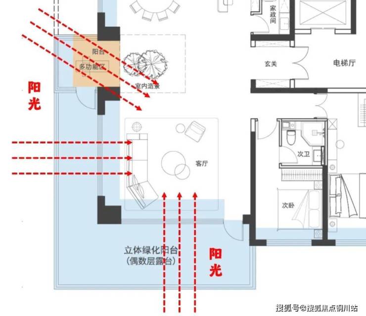 而绿植后与露台相连部分,可以放置洗衣机、户外桌椅等,或是改阳光书房、茶室等兴趣空间,兼容日常需求。