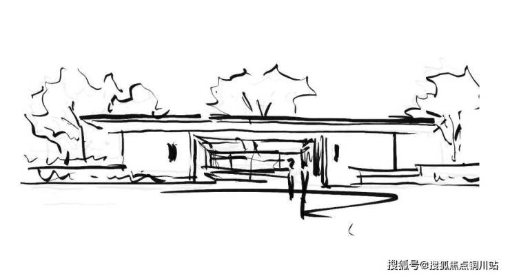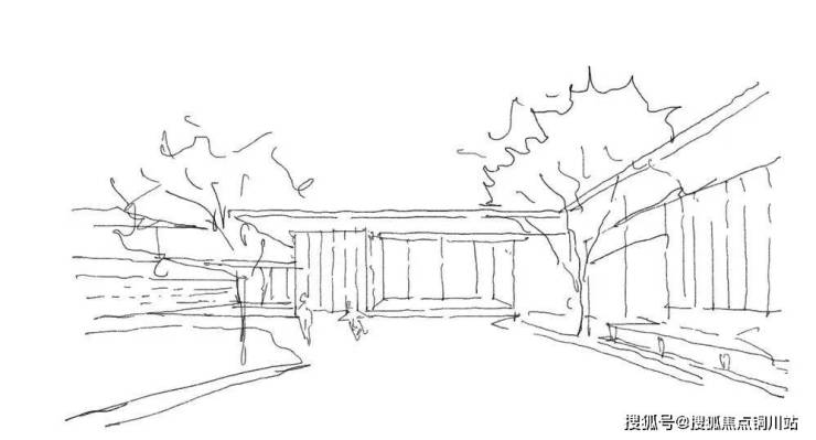 对景墙上水幕跌落,几何宽幕配以高大的丛生乌桕来界定视觉至高点。轻薄的飘板悬于片墙之上,树影斑驳,婆婆娑娑映照于墙面,使时间与光影重叠。