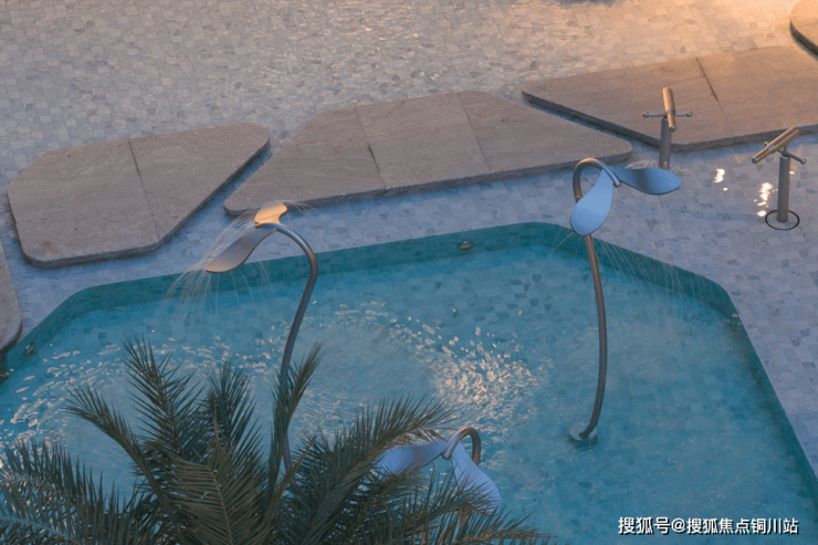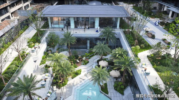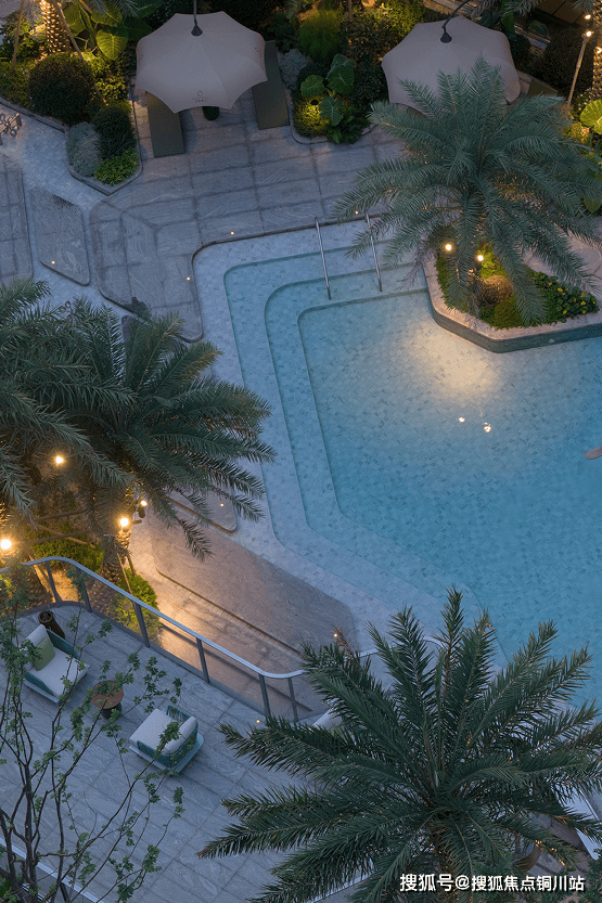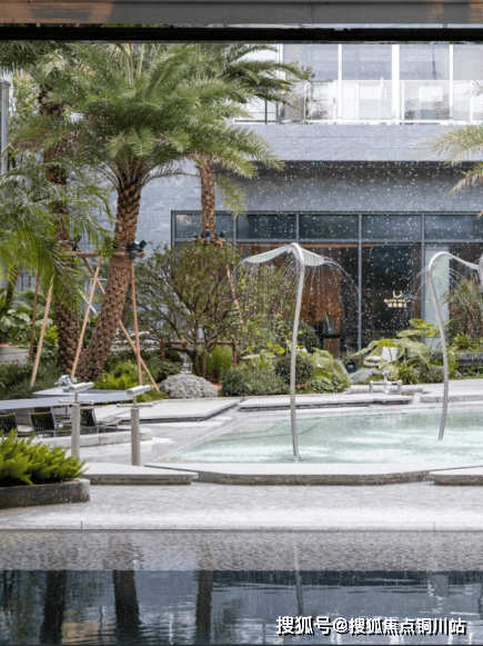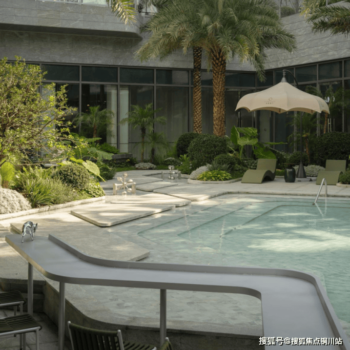 项目深度溯源斐济原生海岛风貌,打造无锡首个悬挑错层戏水池,成为庭院的视觉与体验核心。10棵挺拔的银海枣树一字排开,羽状叶片摇曳生姿,搭配低层热带植被,复刻南太平洋的热烈。