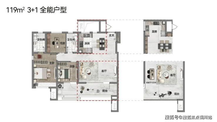 119㎡的户型,不但在成功控制总价的基础上,还有了更多空间的科学规划。因为有了北向设备平台的外拓,厨房空间感直接拉满,实现了中西餐厨和独立餐厅,让一家人的烟火日常有了更从容的模样。因为有5.4米宽厅,可以轻松实现3+1功能的空间,这就给了家庭陪伴子女陪伴和教育,有了更多可能,可以对孩子进行课业辅导,交流互动等。