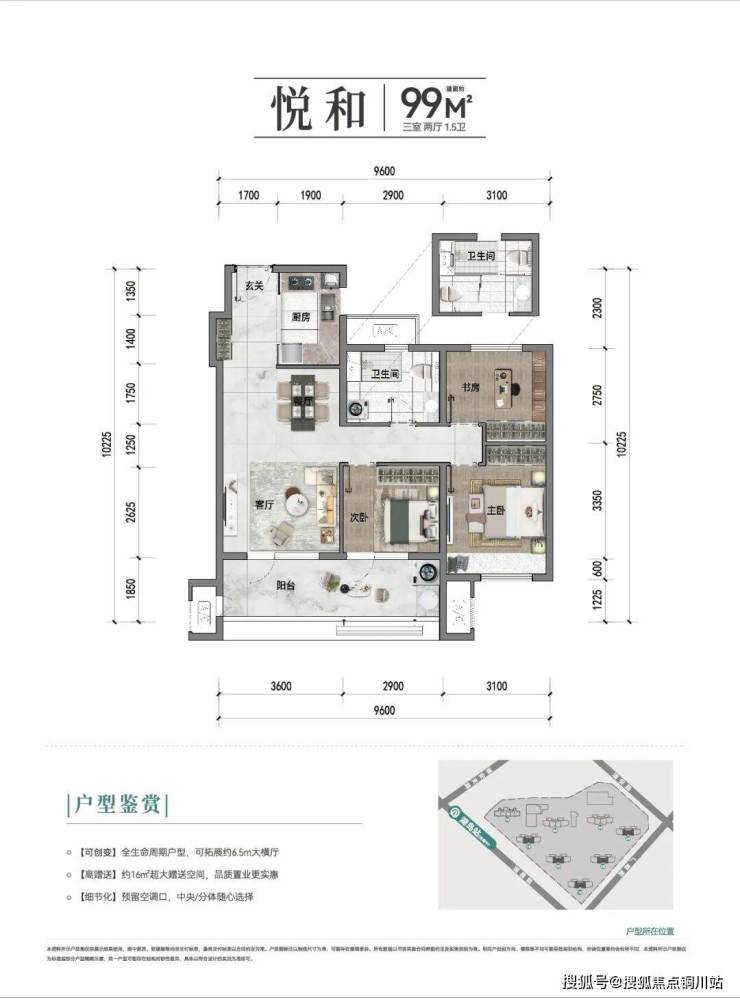 99㎡的悦和户型,除了90%高得房率,2.3米进深阳台,和独立餐厅等核心卖点,老王觉得最大的亮点在于1.5卫的设计。