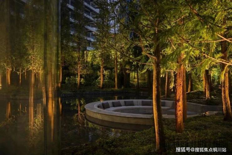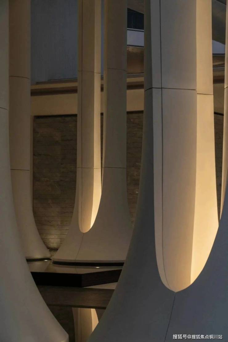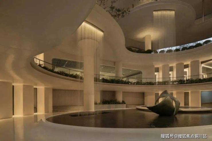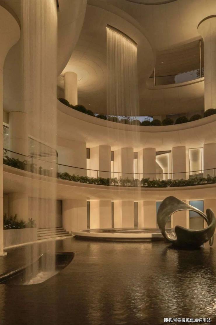 内部中庭堪称项目的另一华彩篇章,三层通高,飞瀑如银河倾泻,巨柱贯穿其间,水元素充盈空间。灯光旨在营造空间悬浮的意境。设计伊始便摒弃常规的拦河灯带勾勒手法,转而思考如何凸显垂直向的力量与延伸感。灯光依循瀑布、绿植及柱体设置,着重强调其竖向的挺拔之势,建筑天花亦随之被自然照亮,宛若漂浮于垂直森林之上的梦幻之境。