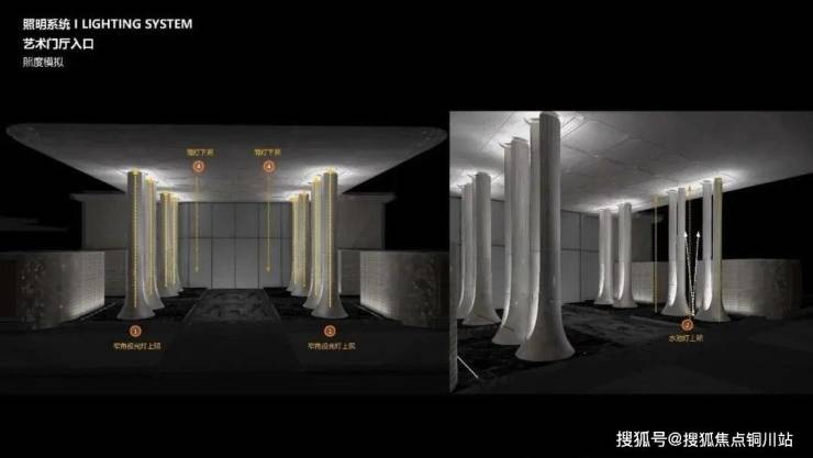 灯具精妙地隐匿于装饰柱的分叉结构内,既均匀照亮柱体内壁,更重点聚焦于柱顶与天花的交接之处。受限于空间,灯光主要汇聚于柱体周围。经照明模拟优化后,我们在镜面水池中增设补光灯,为天花中部提供均衡补光,确保天花中部与两侧的亮度维持和谐比例。地面功能性照明方面,我们秉持“空间秩序优先于地面照度”的原则,仅结合天花造型点缀少量筒灯补光,主要依靠空间内透光及天花反射光满足需求。