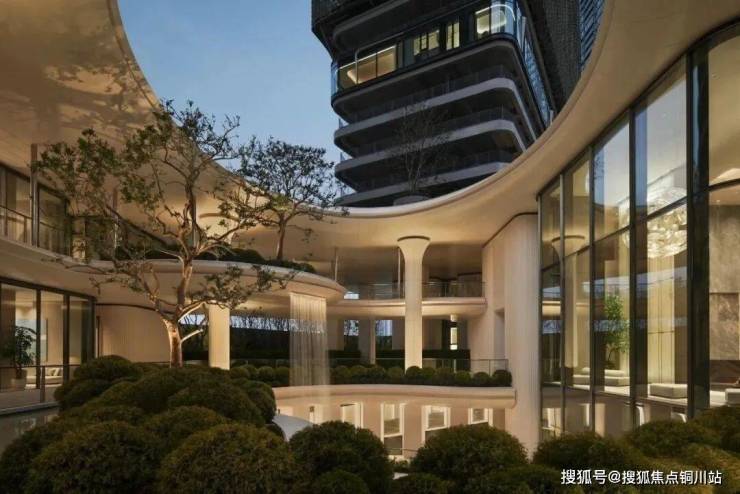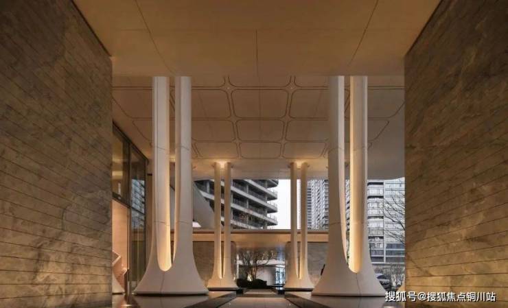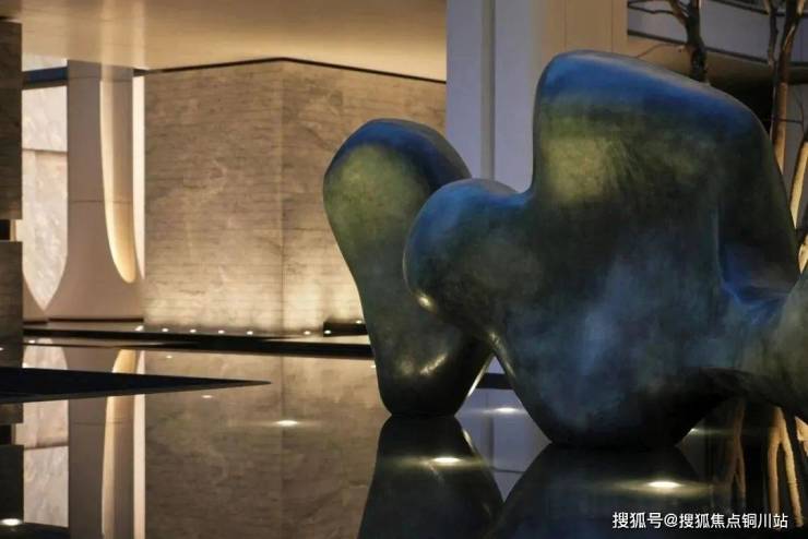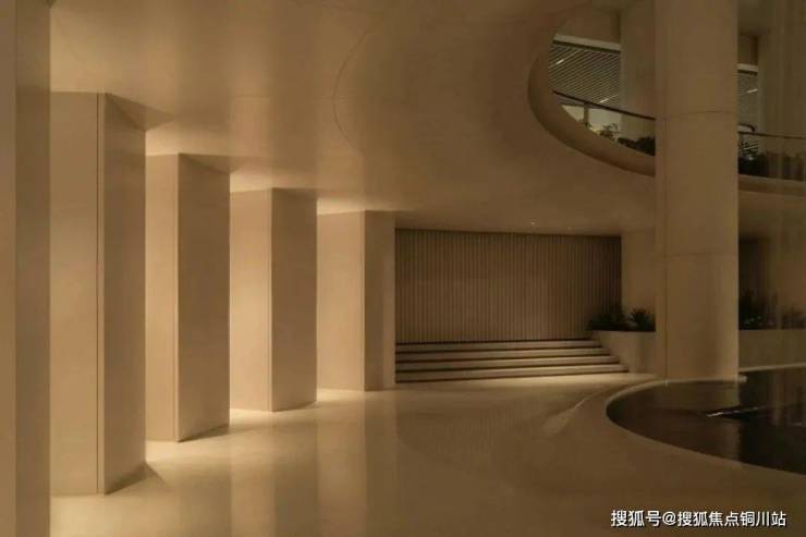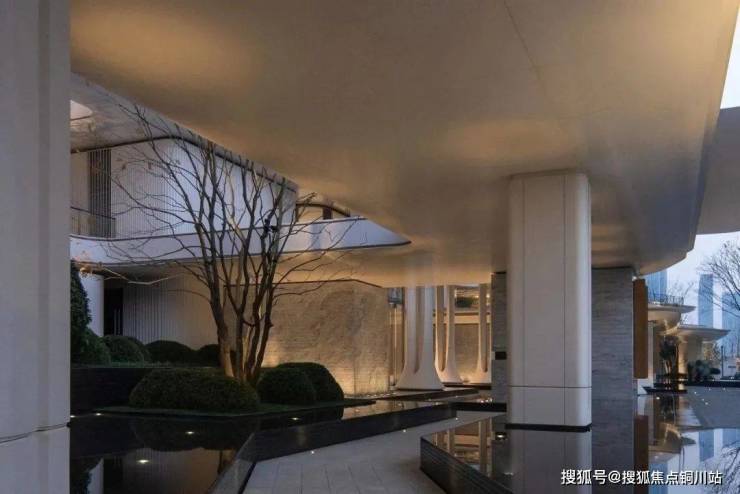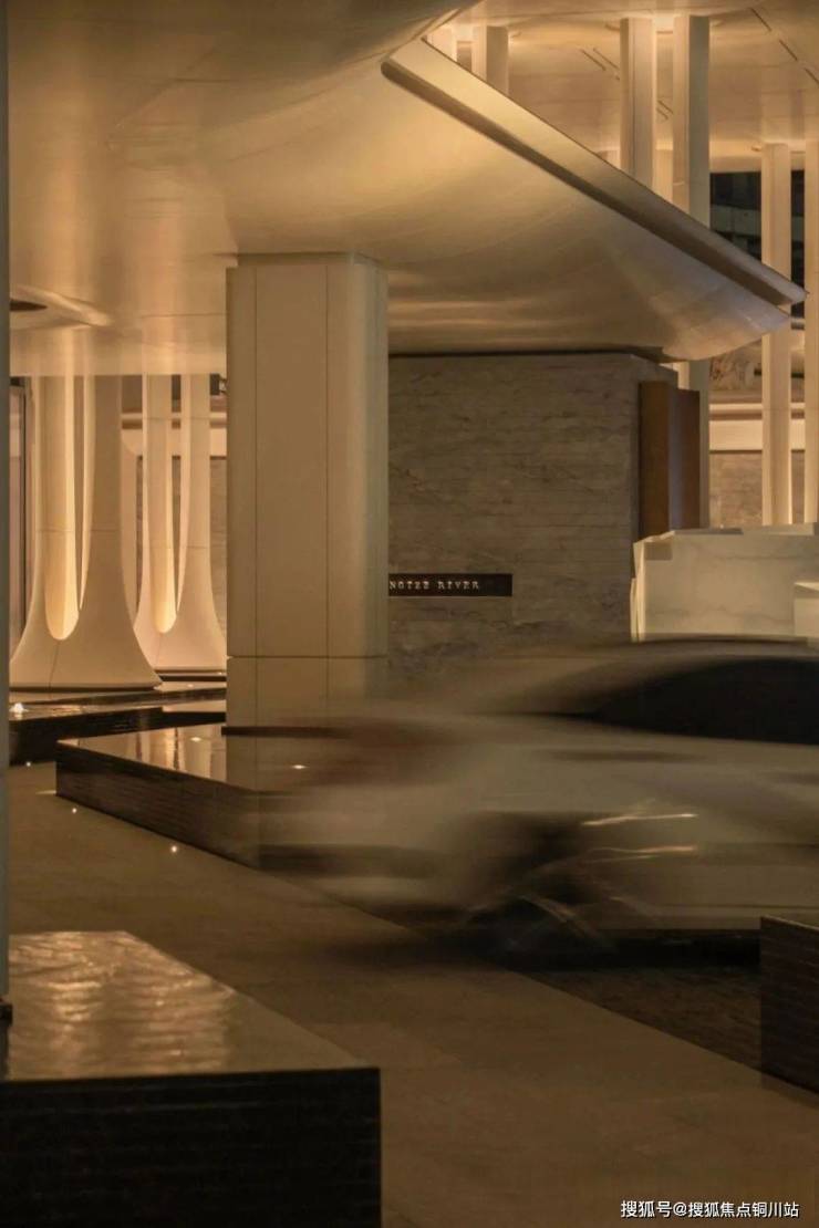 空间设计别出心裁,大堂并非直临街面,而是借由一段幽雅门廊与外界相接。在视觉秩序上,恢弘的挑檐天花构成最明亮的第一层级,其光韵由外向内绵延至10米挑高的入户大堂空间。门廊之内,立面墙体与葱茏绿植构成第二层次,灯光精妙点染,形成步移景异的视觉画卷。地面水景与花镜则作为第三层次,光感幽微静谧,着重勾勒建筑材质的肌理与细节,将精致与尊崇,无声地传递给每一位到访宾客。灯具巧妙隐于水景、植被与雕塑之间,光线皆由下而上漫射。此举不仅点亮了天花,更将水面涟漪投射其上,将水的元素由水平引向垂直维度,令空间产生轻盈悬浮之感。整体光环境柔和宁谧,细节精雕细琢,宛如将喧嚣都市中的人们温柔引入归家的心灵港湾。