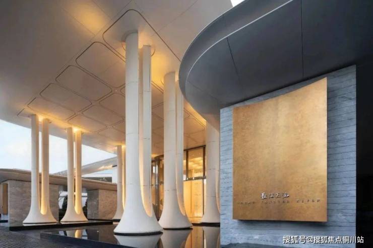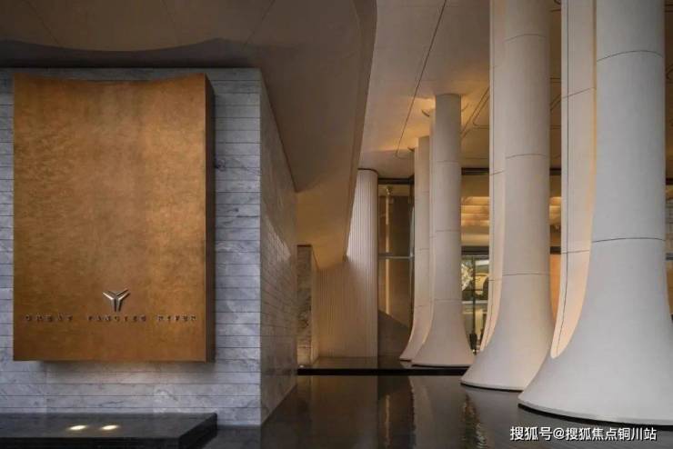 穿越门廊,即步入入户大堂落客区。10米层高下,8根异形装饰柱擎立其间,构筑出恢弘大气、仪式感十足的空间。灯光设计延续门廊的亮度规划理念,着力强化天花的漂浮感与水波光影的投射。如何巧妙依托装饰柱体藏匿灯具,同时完美照亮天花,成为设计的关键所在。