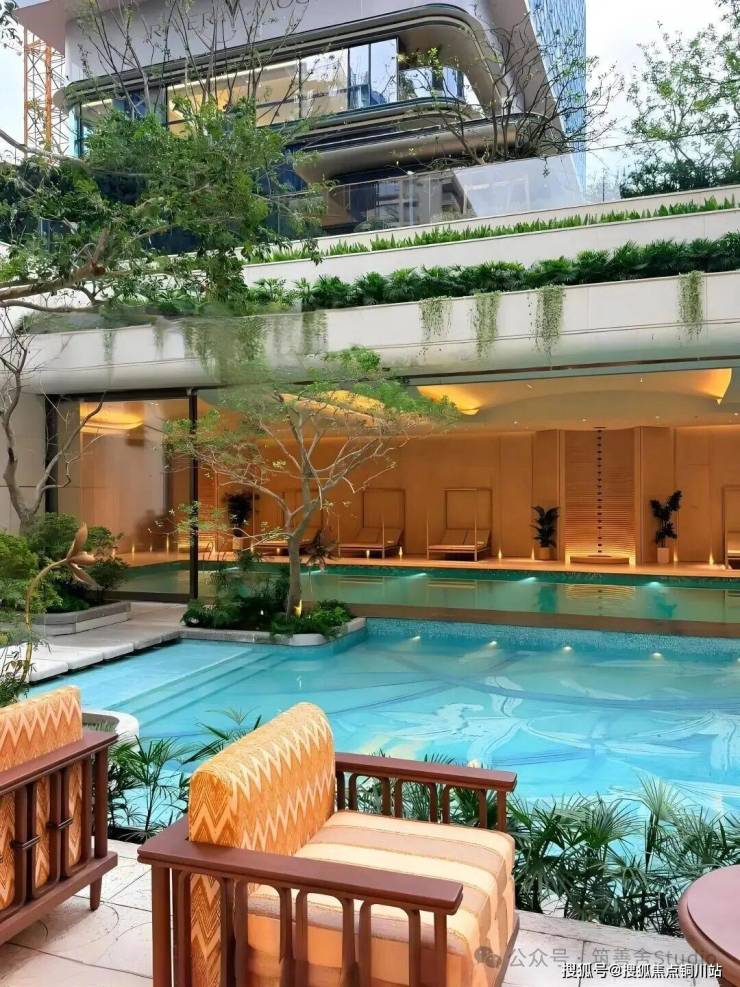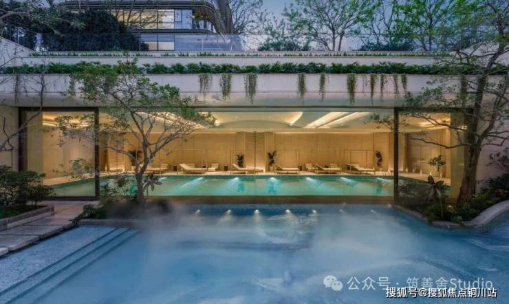 以《红楼梦》中“大观园”为灵感,蕙澜月华打造一座立体叠合的山水园林,通过山水意趣的象征表达与建筑即景的精巧融合,呈现“芥子须弥,小中见大”的东方美学意境。约320米的下沉式庭院,仿若山谷溪涧,营造出“瀑布挂崖间,飞空作碧玉”的壮丽景观;室内恒温泳池与室外嬉水池间,采用可开可合的设计,模糊内外界限,实现自然与建筑的和谐共生。有氧健身空间以“玻璃盒子”的挑空姿态,悬浮于下沉庭院之上,为运动者带来开阔视野。在这里,健身的先生、游泳的太太、嬉戏的孩子,既各享其乐,又共享视线中的陪伴,多维场景的高频互动,诠释了奢华的真谛——不仅是空间,更是情感的交融。