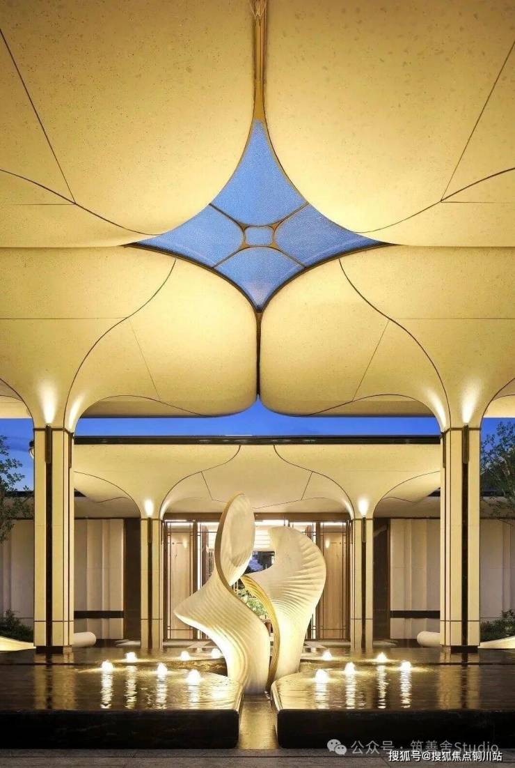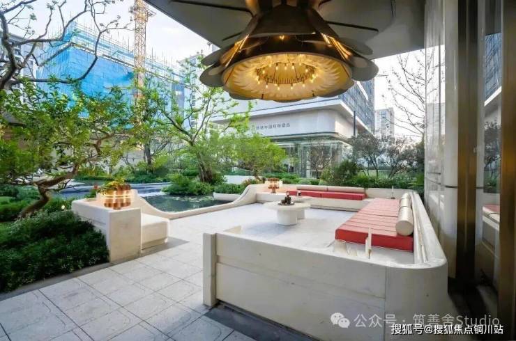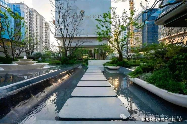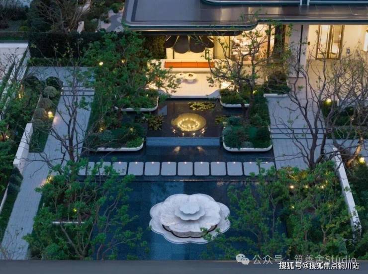 下沉式庭院巧妙借鉴自然山谷的形态,以叠水、绿阶、浮岛等元素精心构筑,呈现“飞瀑挂崖”的生动景致。庭院中央的女王画舫若隐若现于林水之间,业主可在此品茗赏景,尽享“都市女王”般的优雅与从容。