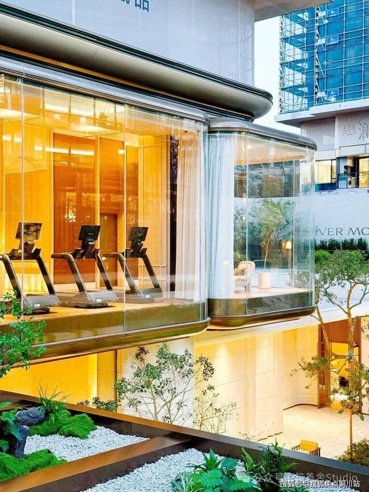 建筑底层精心打造主题架空层,内设多功能空间,包括有氧健身区、儿童游乐场及女王花园等。其中,有氧健身区以“玻璃盒子”造型悬浮于下沉庭院之上,业主锻炼时可透过玻璃幕墙尽览瀑布景致,实现“内外无界”的健身体验。
