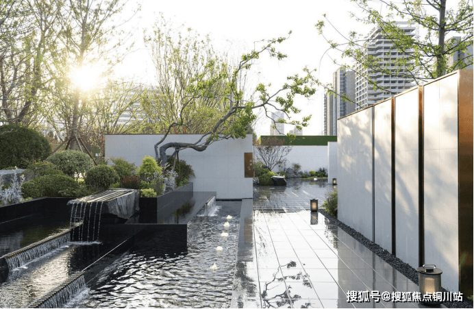 项目景观设计以“起承转合”的叙事手法,巧妙地将山石叠水、娜塔栎林与建筑融为一体;承袭东方园林的造园智慧,以当代手法演绎传统美学。从入口到内院,山石、流水、植物与建筑相映成趣,移步异景,宛如穿行于立体的山水画卷。层叠错落的山石与跌宕流水,谱写自然的乐章;乌桕林掩映下的迎宾景墙,以淙淙水声隔绝喧嚣,带来一场视觉与听觉的双重盛宴。