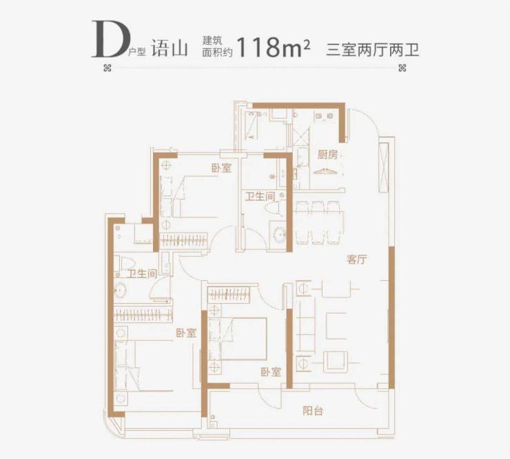 建面约107平和118平,三室两厅两卫布局,约3.05米室内挑高,南向最大约9.9米采光面,双阳台设计,LDK餐客厅一体;主卧套房设计配备独立卫浴,私密居住体验,尺度奢适,更宽绰。